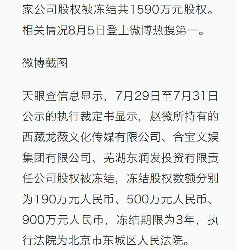 8月5日,有消息称赵薇名下 1590万的股权再次被冻结,冻结期限是3年。而这事在7月29日到 31 日的判决书里早就写明了。