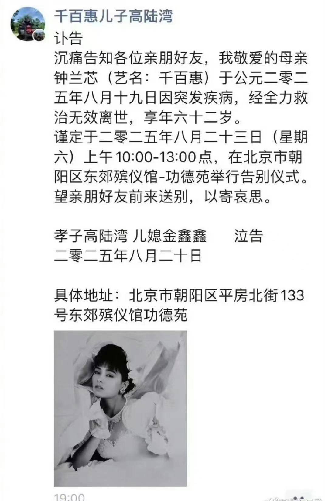 千百惠和内地音乐人高大林所生的儿子高陆湾在朋友圈发布讣告,透露母亲的葬礼定在8月23日,希望亲朋好友前来送别,以寄哀思。千百惠是8月19日凌晨突发疾病去世,享年62岁。