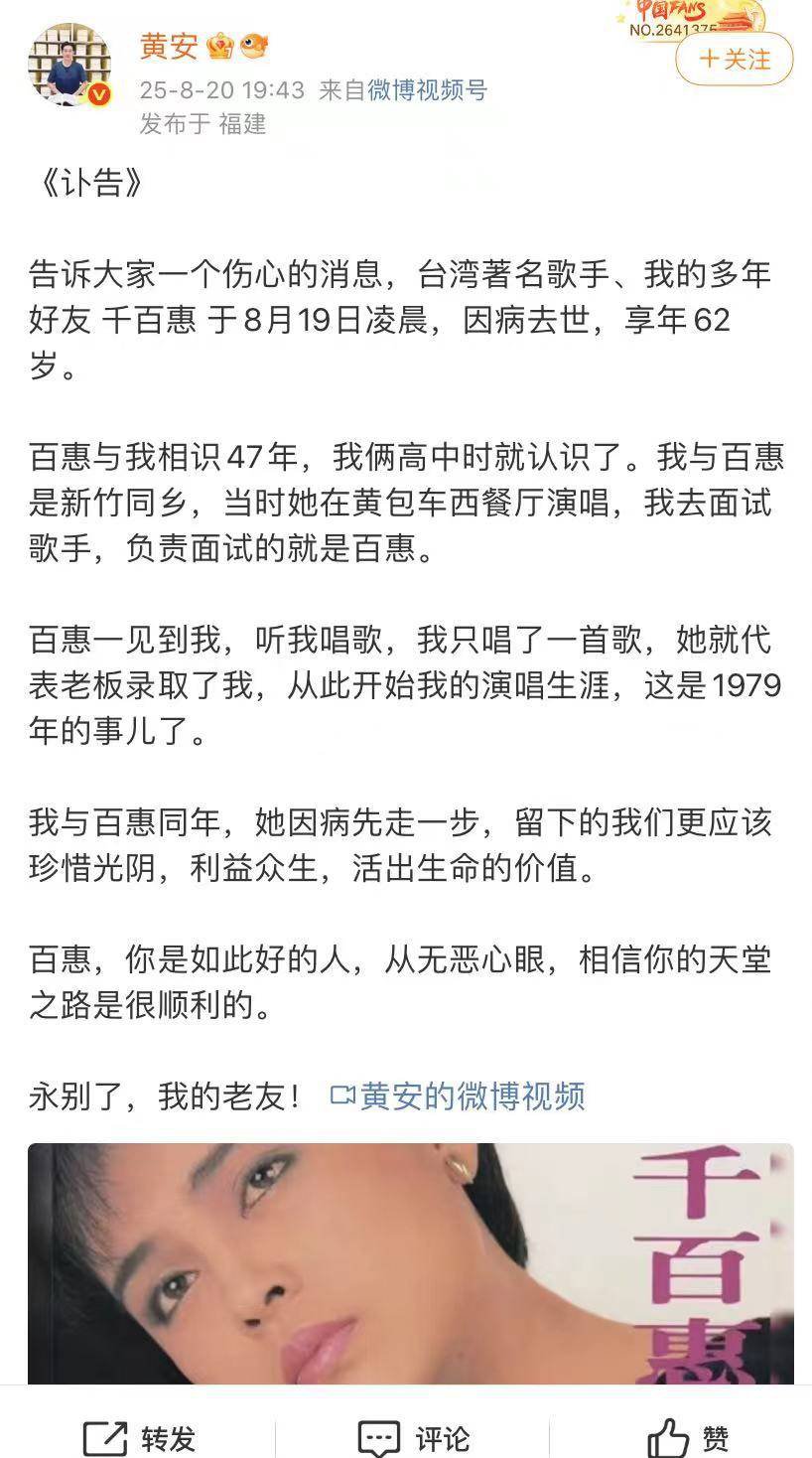 同龄的黄安发文悼念千百惠,他们互相欣赏,惺惺相惜,而且他们都一直生活在内地,成为最爱国的中国台湾省歌手。