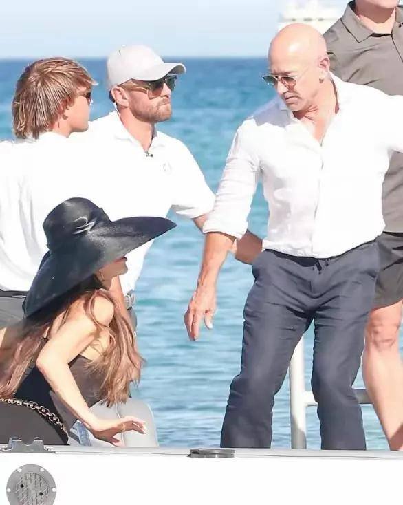 能看出来他心情十分不错,一直跟媒体打招呼,也一直在跟游艇上的工作人员聊天。他对桑切斯也比较贴心,一直扶着她,还拉着她上游艇。