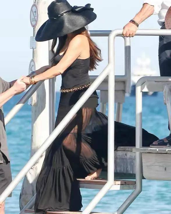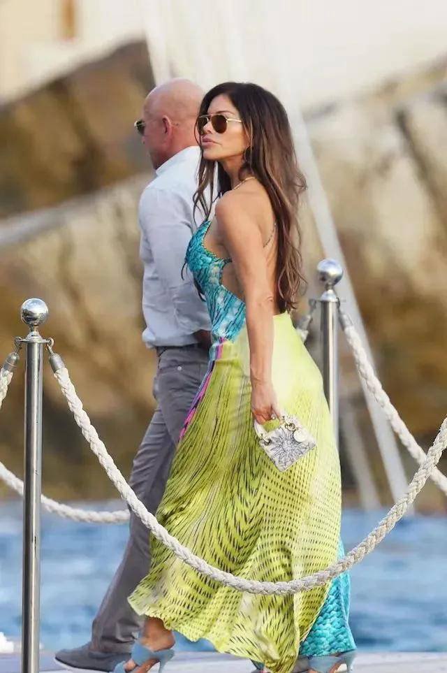 这次在圣特罗佩,桑切斯两套造型都挺漂亮的,一身黄绿相间的挂脖长裙,亮闪闪的很是吸睛。另一套造型是黑色收腰鱼尾裙,戴了宽大檐帽,很度假风,也很老钱风。