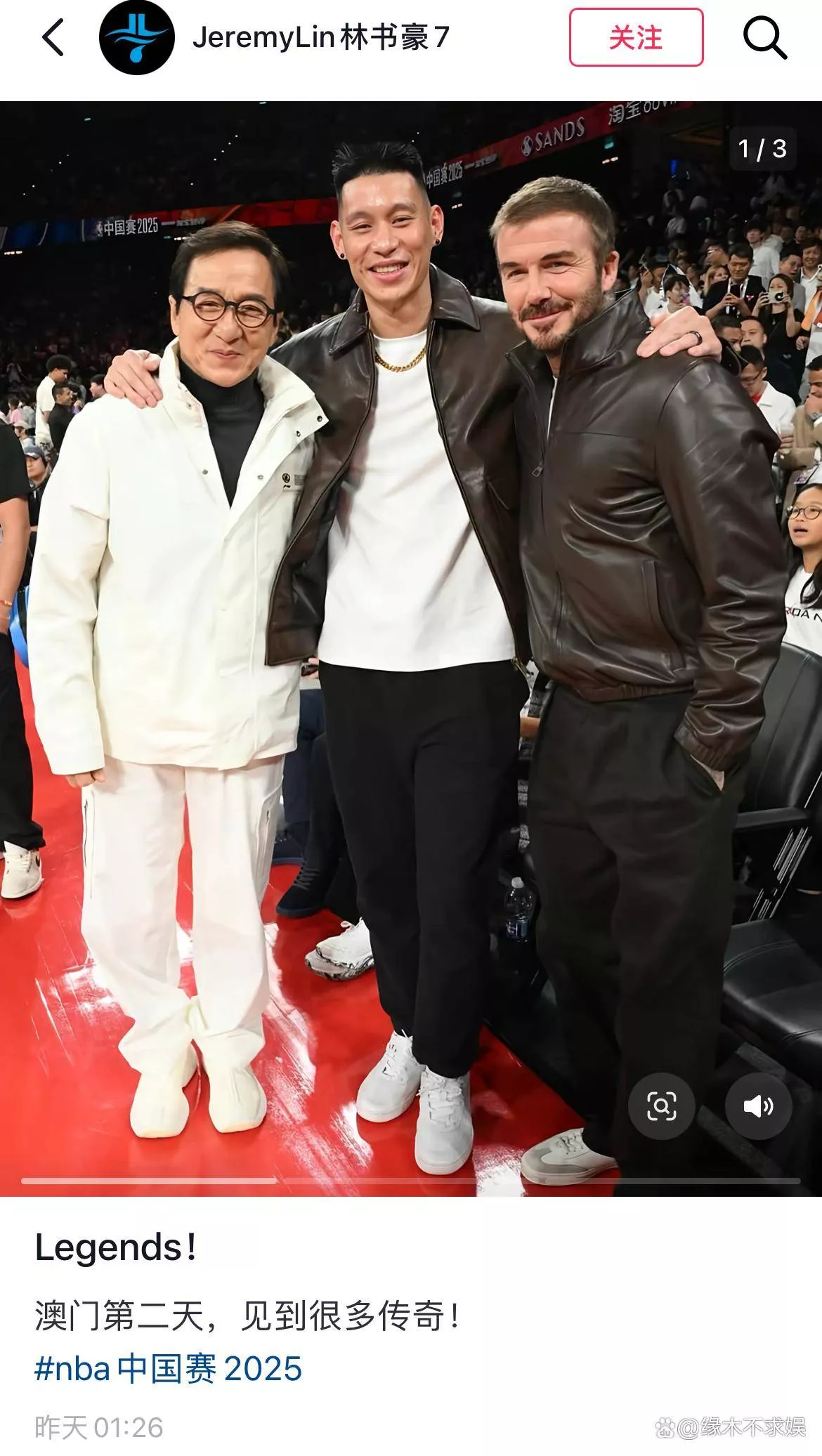 林书豪晒出与成龙和贝克汉姆的合影,并配文称自己来到澳门第二天,见到了许多传奇人物。换言之,在他眼中,成龙和贝克汉姆都是一代传奇。然而,这张合影却引来网友质疑,认为他缺乏礼貌,竟然站在两位大咖的中间。