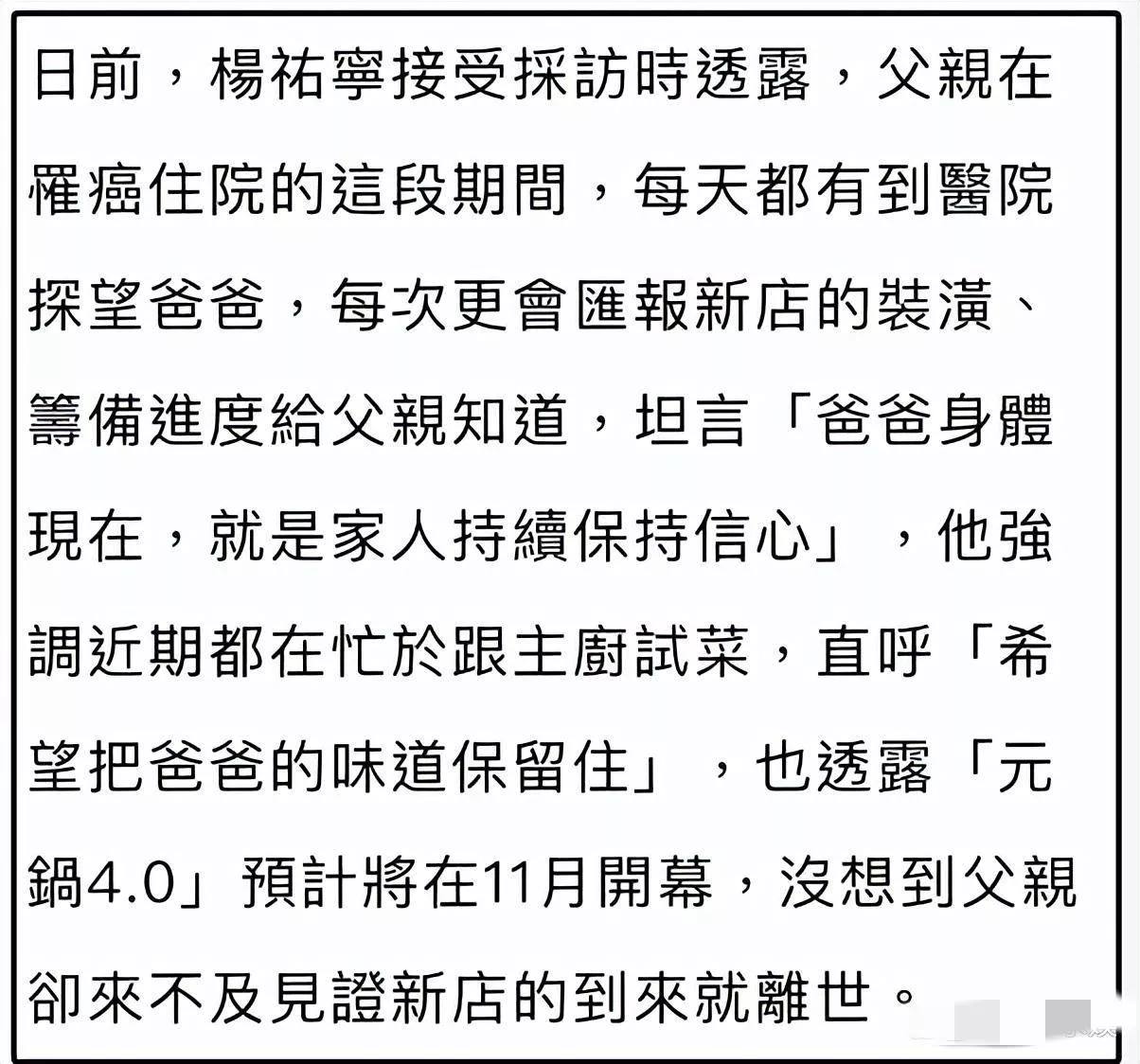 杨祐宁的父亲杨进元在台湾颇有名气,是一位美食家并创立了自己的火锅品牌,吸引了众多明星成为常客。儿子杨祐宁也一直积极协助管理其餐饮事业,品牌已初具规模。可惜天不遂人愿,杨父在确诊癌症前一个月才宣布退休,或许也是因身体状况逐渐恶化所致。