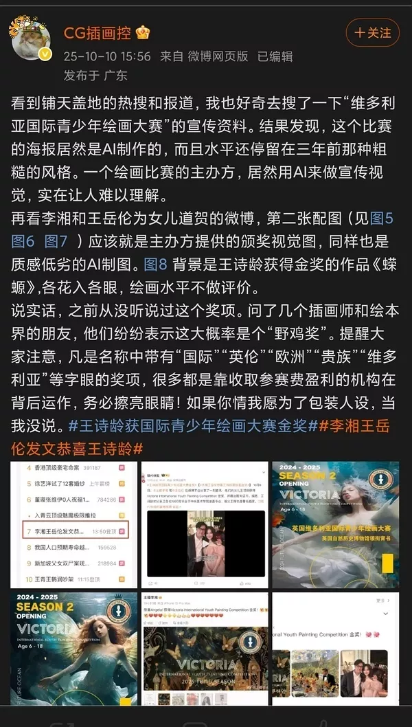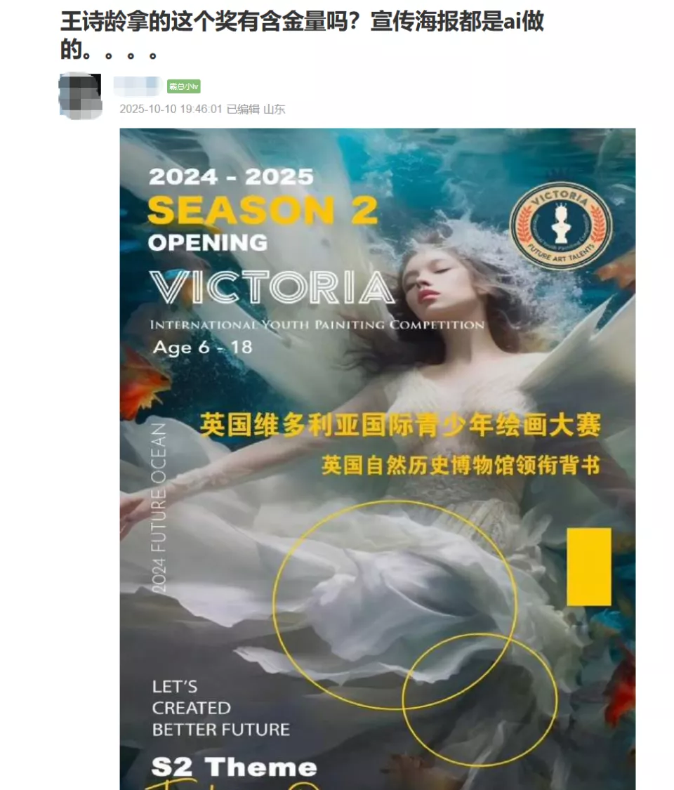 不过,这次获奖却遭到了不少质疑,有网友扒出该奖项的宣传海报疑似是AI做的图,还问了业内朋友,大家也都不知道这个奖项。暗指王诗龄是在“包装人设”。