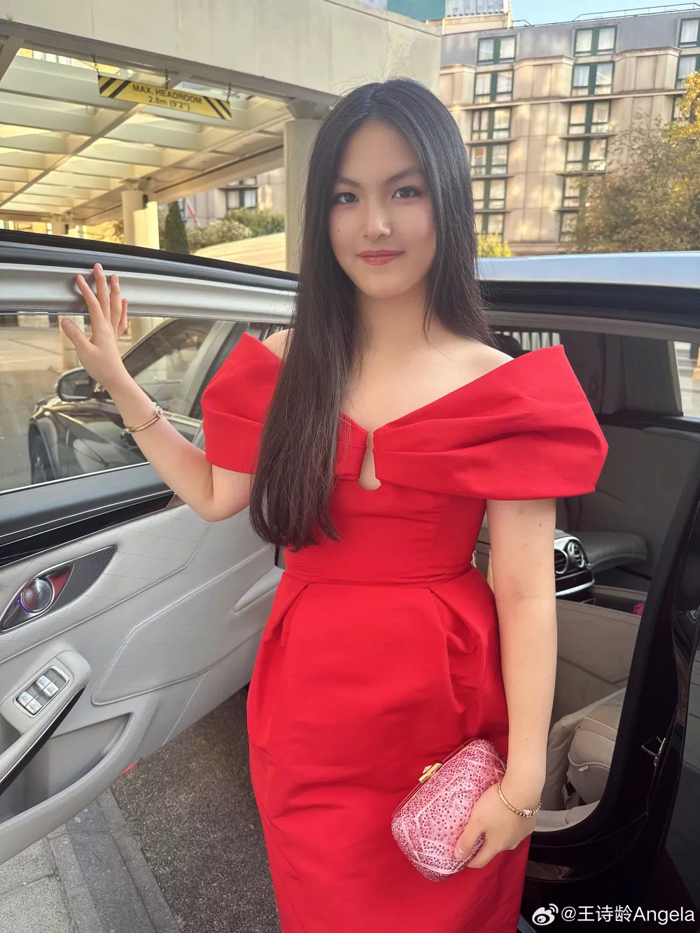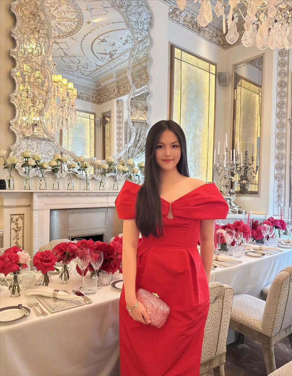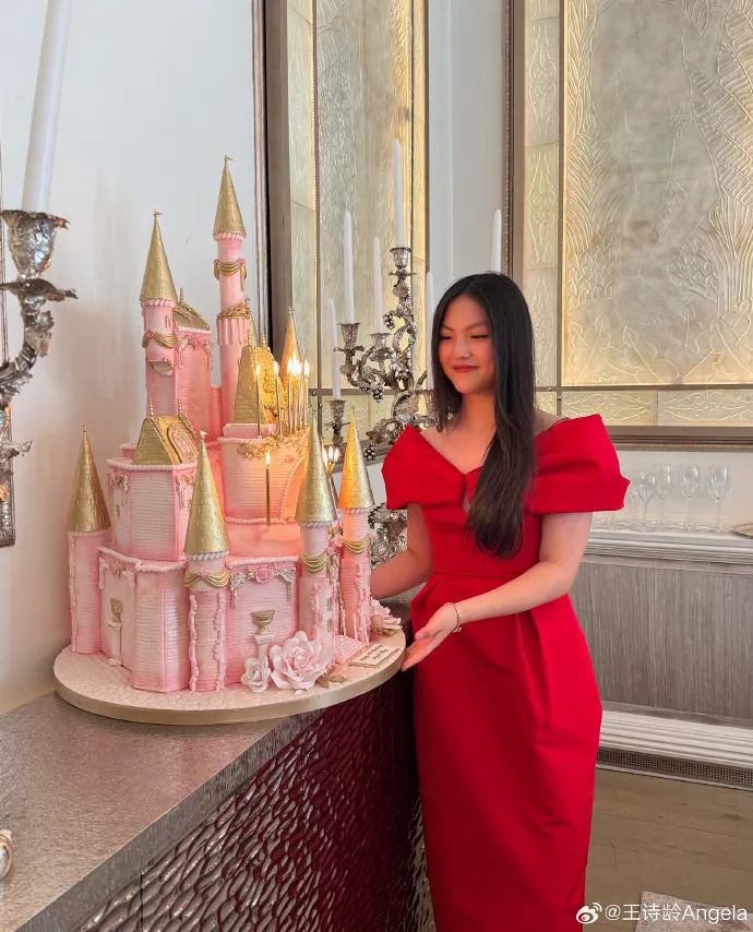 生日派对现场富丽堂皇似城堡,王诗龄身穿大红色礼服,端庄优雅。