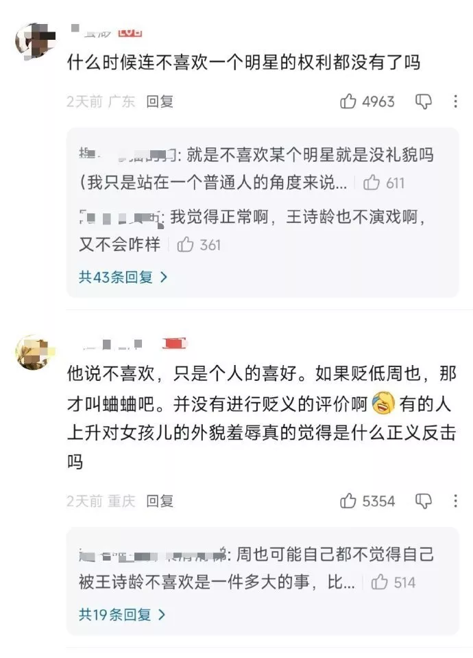 另一拨认为这个声音是否是王诗龄还不能确定,即便是她说的,也只是在跟自己的家人说不喜欢的人,并不是故意要传到网上,但周也的粉丝却故意去网暴王诗龄。