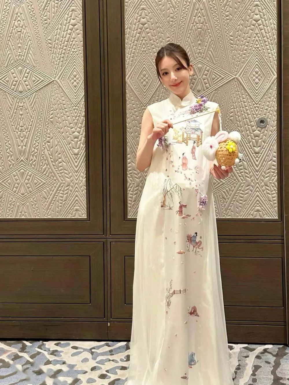 俩女儿则穿着同款新中式旗袍,扎着丸子头,还戴着同款粉色花花,虽然俩姑娘都被贴纸遮住眼睛,但也能看出是漂亮小姑娘。