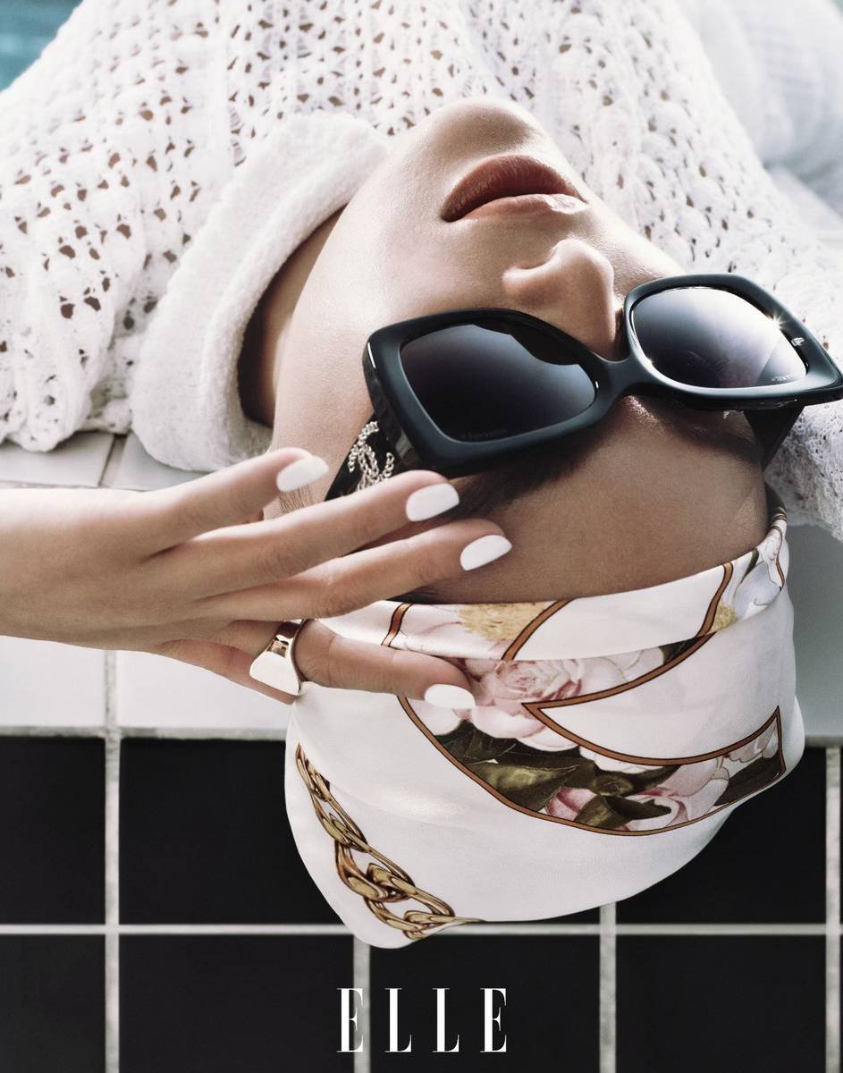 辛芷蕾戴着墨镜,半浸水中,造型前卫。