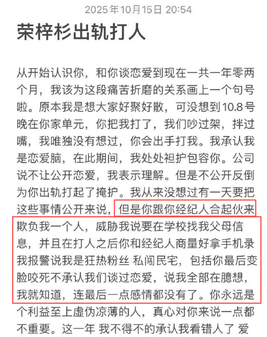 但之后荣梓衫情绪反复,又否认恋爱,还冲到女方家发疯,试图用各种方式威胁女方。而女方这期间发现荣梓衫出轨的女性当中还有童星演员。