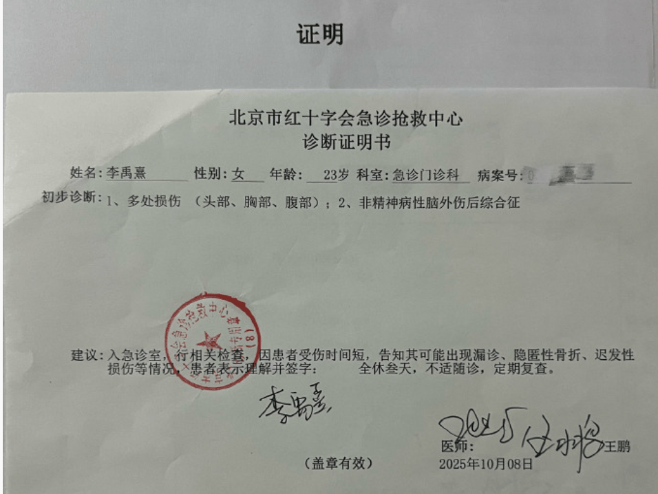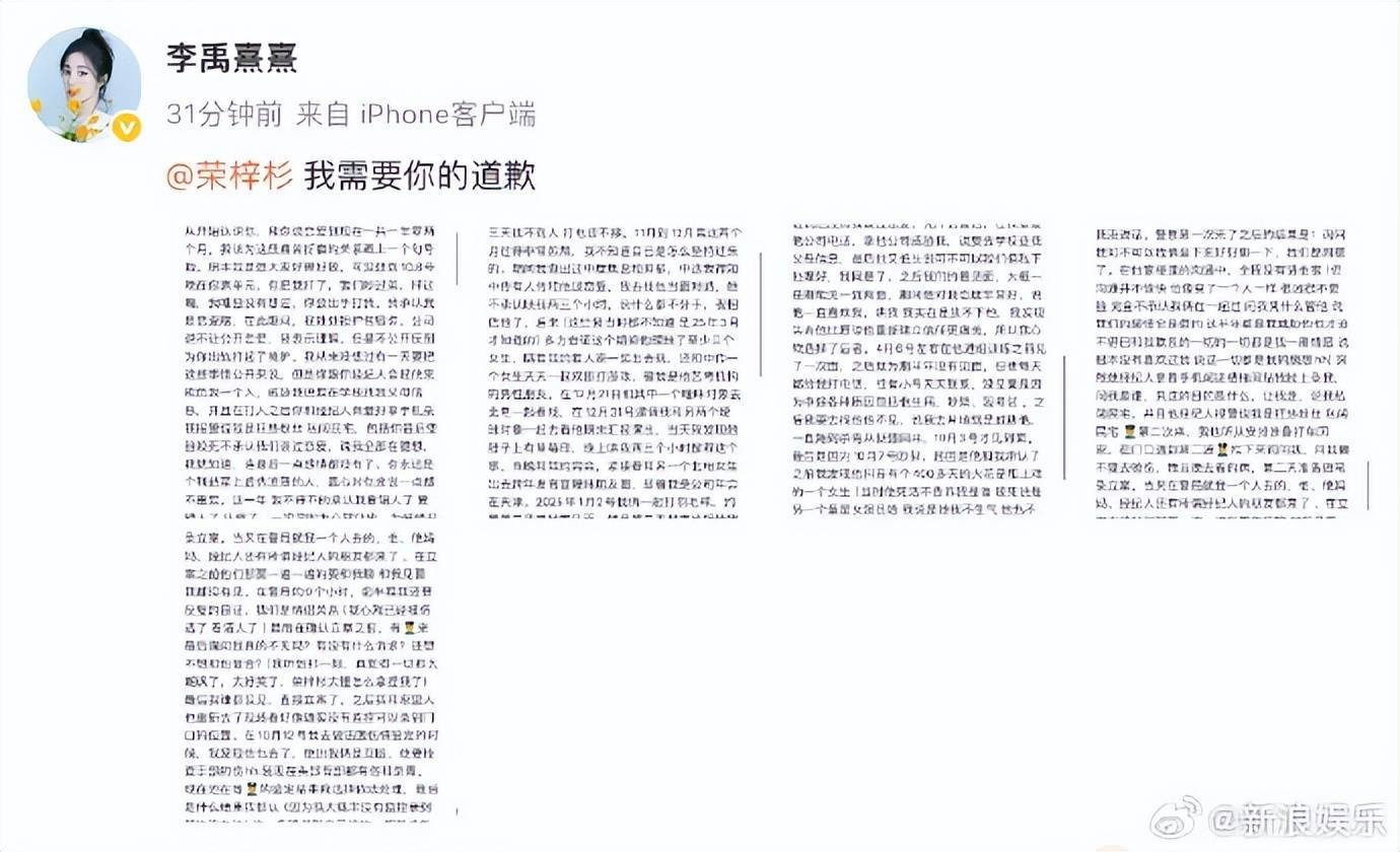 李禹熹熹称自己与荣梓杉恋爱时长一年零两个月,对方恋爱三个月后开始冷暴力,期间与多名女性暧昧,自己因为荣梓杉冷暴力一度确诊中度焦虑和抑郁,喊话他出来道歉,并晒出了报案回执和医院诊断证明。