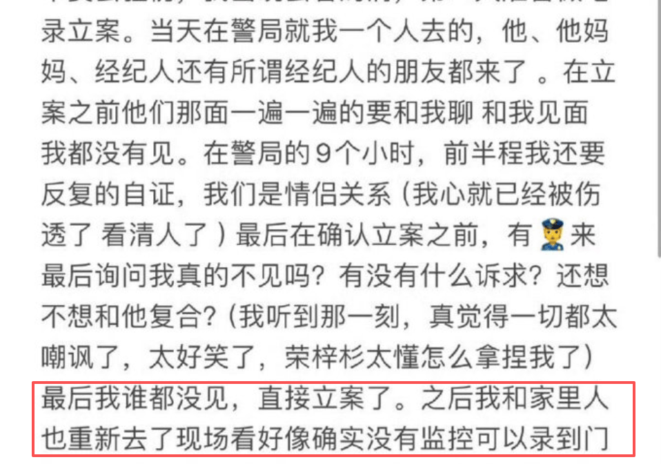 荣梓衫经纪人甚至设局录音把女方打成私闯民宅的粉丝报警,但看到女方力证两人是恋爱关系,荣梓衫那边觉得情况不妙,还试图用复合哄骗女方息事宁人,女方被打后清醒了,拒绝和解。荣梓衫又把单方面殴打说成双方互殴。目前女方还在等待检查结果,表示接受任何结局。
