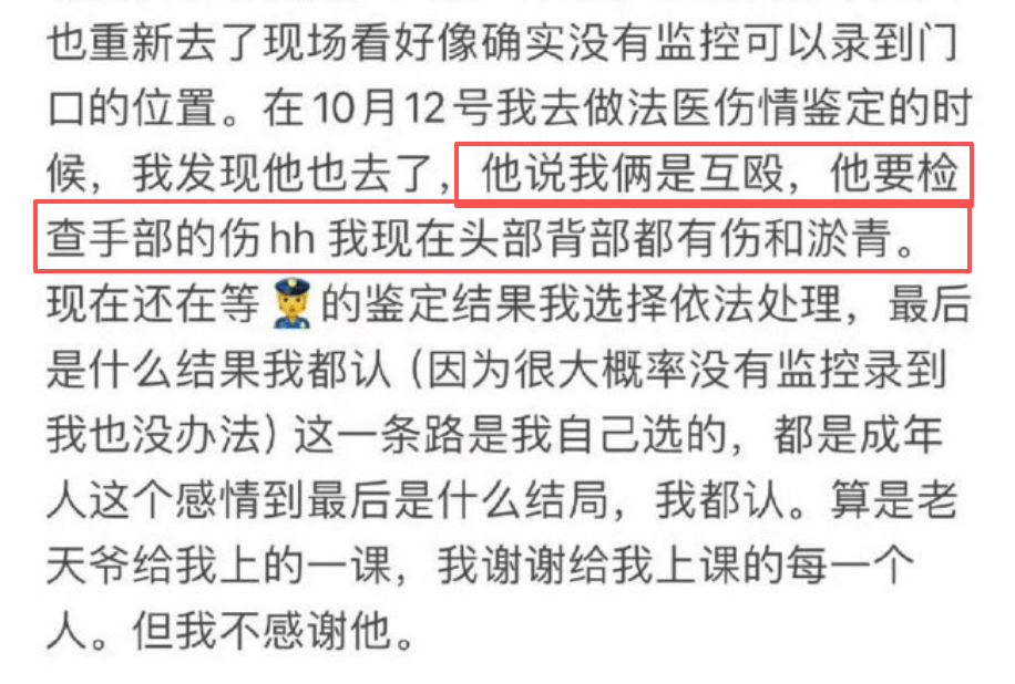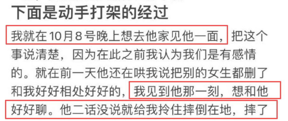 荣梓衫打人事件发生起因也是女方想要解决两人的问题,所以约见在男方家,刚一见面男方就把她拎起来摔倒在地,连摔两次,头和肩膀均受伤,还踹了她一脚,并放狠话“聊不了,你不是要撕破脸吗,报警吧”,女方并没有还手而是直接报警。荣梓衫到警局后还试图否认恋情,把女方打成疯狂粉丝,称自己被威胁。