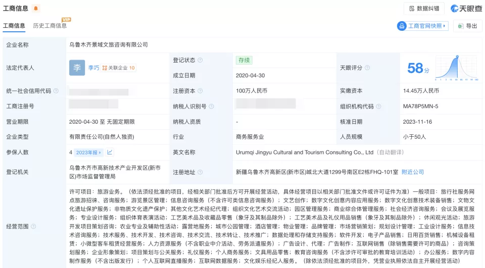 “宿行中国”关联公司为【乌鲁木齐景域文旅咨询有限公司】,该公司成立于2020年,法人为森林北(原名李巧)。