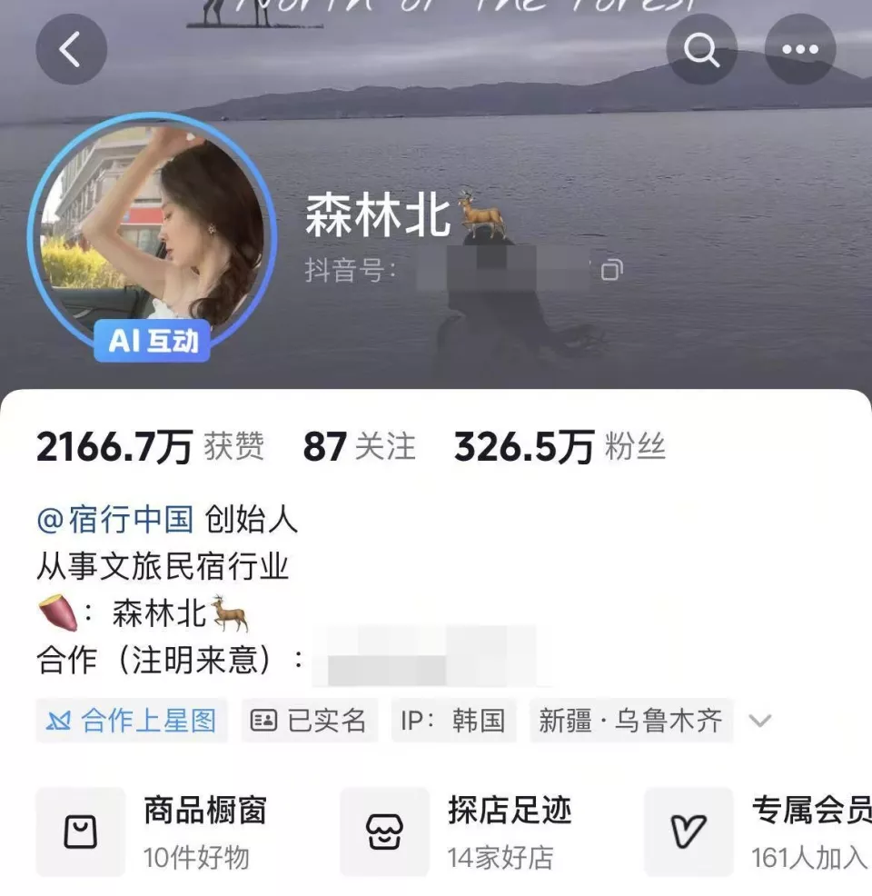 森林北在抖音有326万粉丝,其账号简介中提到,她从事文旅民宿行业,为“宿行中国”创始人。
