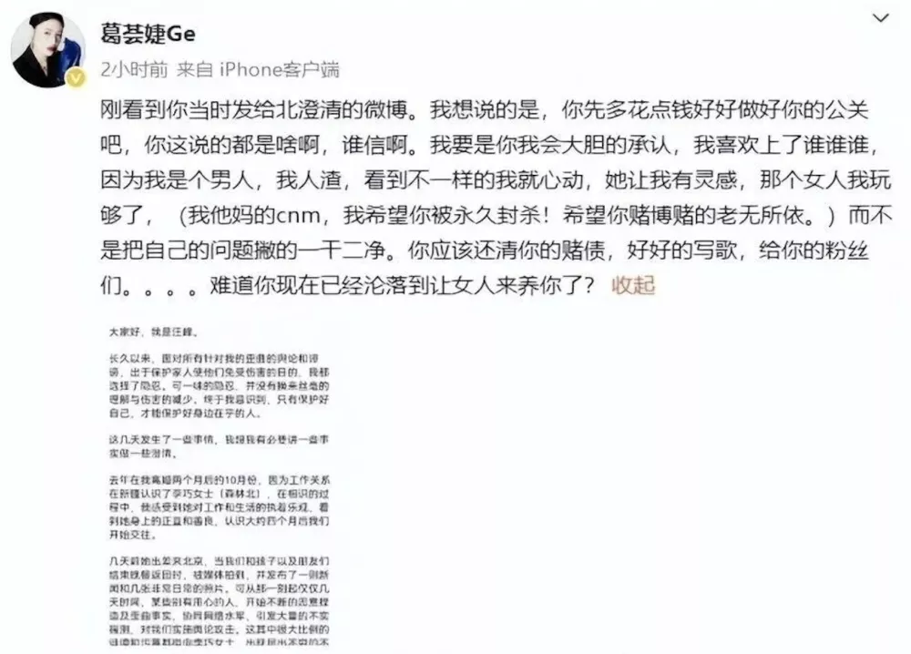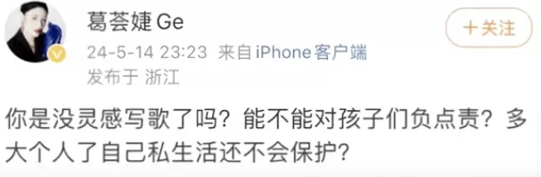 2024年5月,汪峰与新女友森林北的恋情曝光后,葛荟婕发博疑似内涵汪峰,“你是没灵感写歌了吗?能不能对孩子们负点责?”