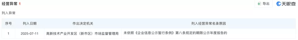 今年7月,该公司因未按规定提交年度报告信息而被列入企业经营异常名录。