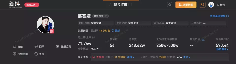 目前,葛荟婕抖音账号有71万粉丝,14日下午,天眼妹点进其账号,发现她正在直播带货。