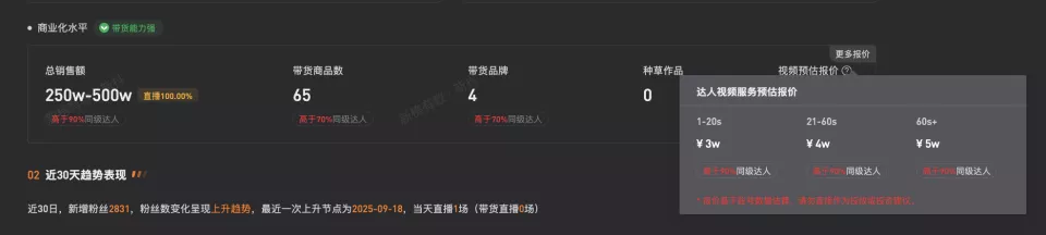 第三方数据显示,葛荟婕近30天直播销售额为250万至500万,其视频报价为1-20秒报价为3万,21-60秒报价为4万,60秒以上报价为5万。