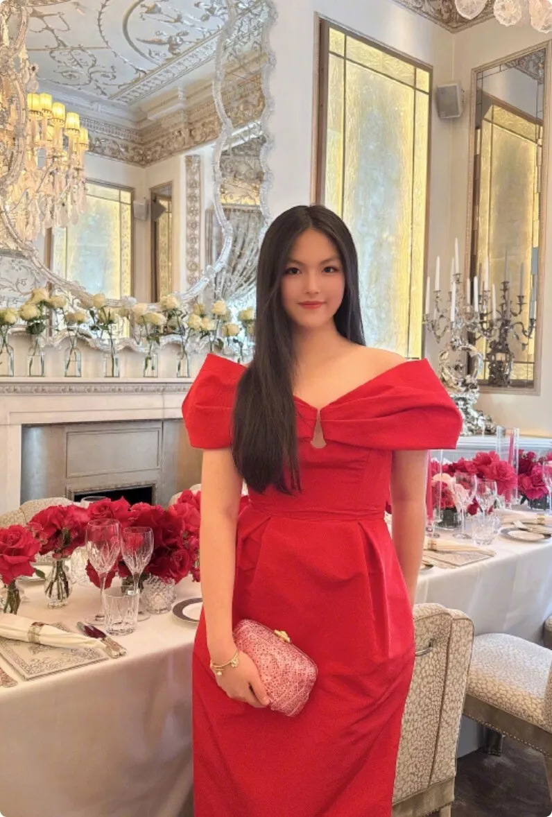 她一袭大红礼服亮相,妆发精致,举手投足都带着从容与仪式感,仿佛一位即将步入社交圈的“小名媛”。