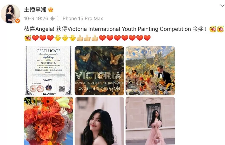 而李湘没过多久又晒出王诗龄获得“维多利亚国际青少年绘画大赛”金奖的照片。