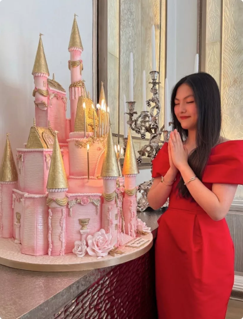 宴会厅被布置成金色的欧式城堡,鲜花、蜡烛、长桌、气球层层铺开,蛋糕放在桌子上,比她还高。