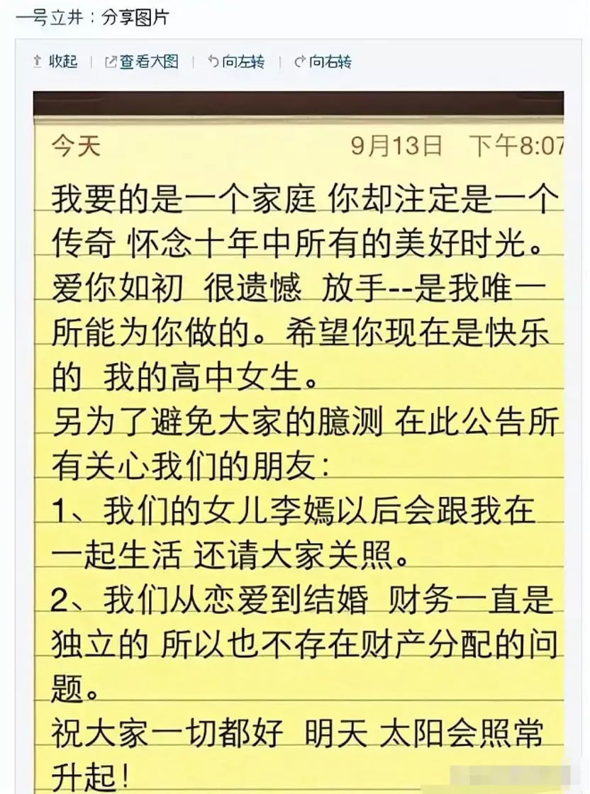 还记得与王菲离婚时,当时还不流行写小作文,王菲以干干脆脆的十六个字“这一世,夫妻缘尽至此,我还好,你也保重”宣告两人婚姻关系走到尽头,李亚鹏则以备忘录写了较长一段文字,他称“你注定是个传奇,放手是我唯一能做的。希望你是快乐的,我的高中女生”,可以说相当有仪式感。