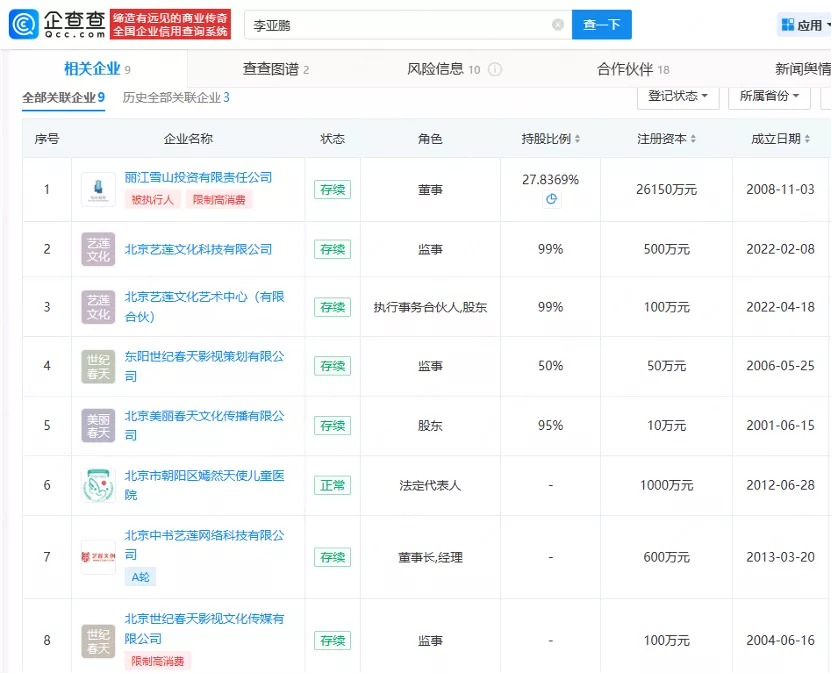 他的债务危机仍旧没有解决,其名下关联9家企业中,丽江雪山投资有限公司仍被法院列为限制高消费企业,部分股权处于出质状态,其他几家关联公司涉及法律风险。从去年开始李亚鹏更加努力直播带货,2024年他一年直播了137场,场均销售250万-500万元,今年也直播了37场,主要带货类目为茶叶。