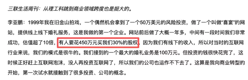 李亚鹏说,1999年在旧金山拍戏,他拿到了一笔50万美元的风险投资,于是做了个提供线上线下婚礼服务的网站“喜宴”。这在当时算是个很新鲜的事物,也得到了彼时年轻一代的认可。这个网站做了一年多,估值据说翻了十倍,接到过最大的单有100万,甚至中途有人要花450万购买“喜宴”30%的股权,但被李亚鹏拒绝了。