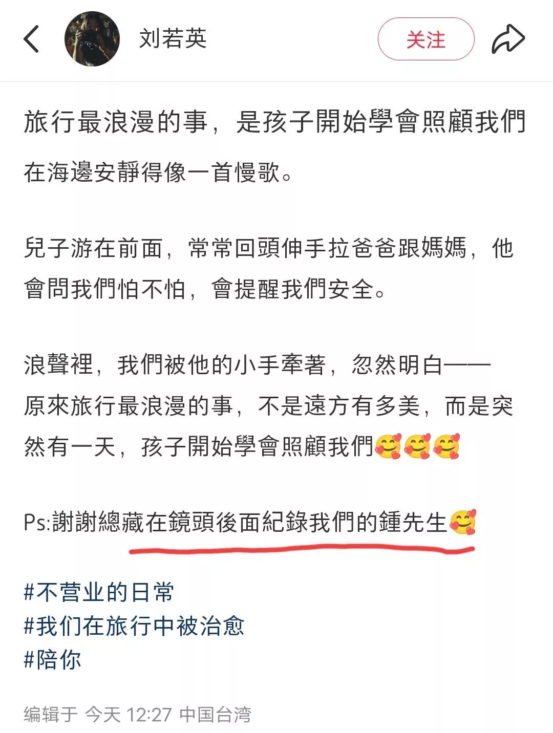 婚后,刘若英大多时间分享的都是生活点滴,尤其是孩子的成长。这次她带着10岁的儿子在海边游泳,母子俩手牵手在水下缓缓游动。她感慨儿子日渐懂事,时不时回头紧拉着爸妈,关切地问他们是否害怕,展现出十足的男子气概。刘若英感动地说:“旅行最浪漫的事,莫过于孩子开始照顾我们。”