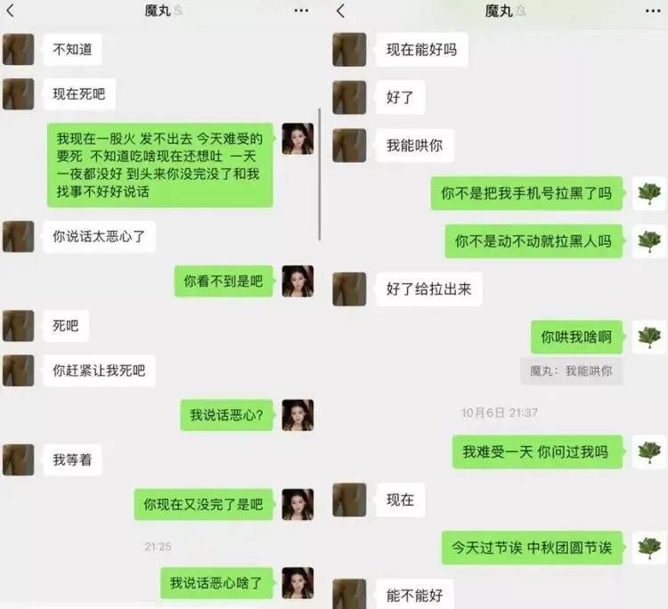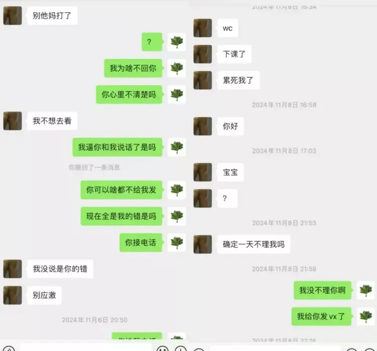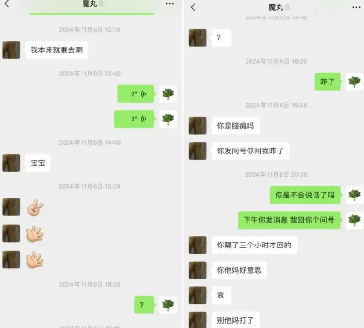 2024年11月6日,荣梓杉开始短时间失联,经常2 3天都联系不到他,即便是联络到荣梓杉,他也是一言不合就开骂,甚至因为女方3个小时后才回消息,就不问原因破口大骂。