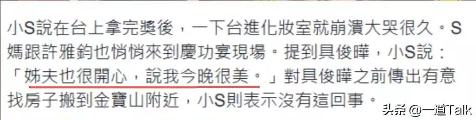 小S被问到时表示,“姐夫也很开心,说我今晚很美”。