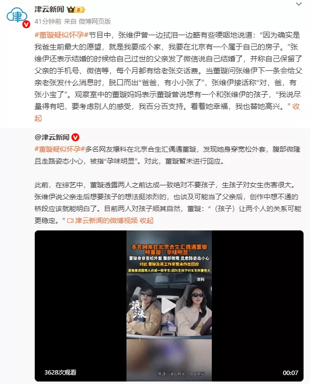 此前,在综艺中,董璇透露两人之前达成一致绝对不要孩子,生孩子对女生伤害很大。张维伊说父亲走后想要孩子的想法挺浓烈的,也谈及可能当了父亲后,创作中想不通的桥段应该就能明白了。目前两人对孩子顺其自然,董璇:“(孩子)让两个人的关系可能更稳定。”