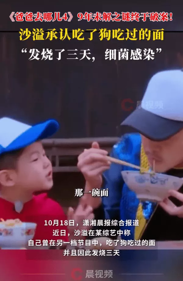 近日,沙溢在某综艺中称,自己曾在另一档节目中,吃了狗吃过的面,并且因此发烧三天。2016年《爸爸去哪儿4》录制中,沙溢与儿子安吉、小鱼儿在任务环节领取早餐面条时,其中一碗被路边小黄狗偷吃,“沙溢到底吃没吃狗吃过的面”被网友称为综艺未解之谜,9年来一直在网络被人讨论。
