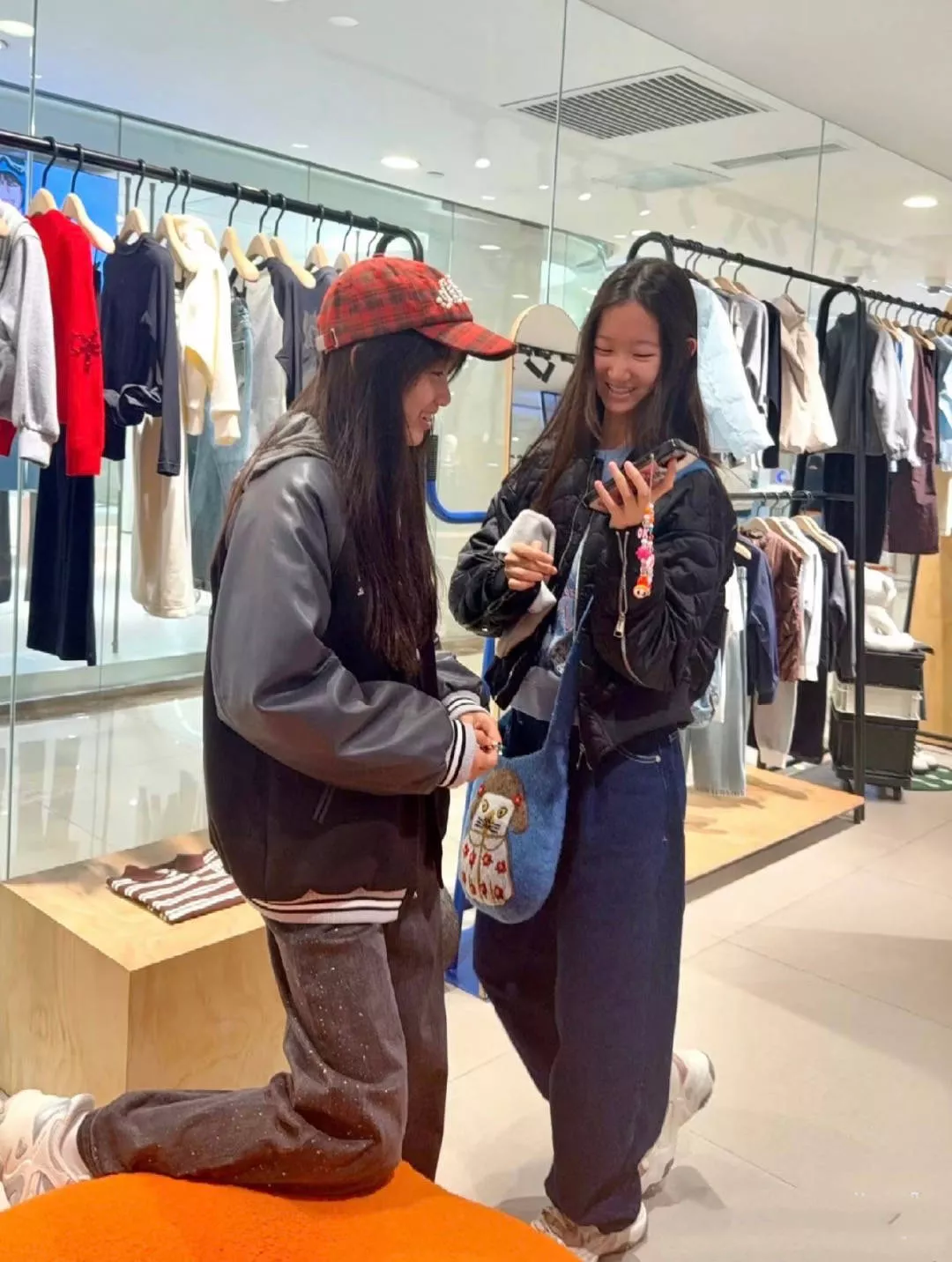 他们逛的是MO&Co的店铺,很平价的一个品牌、衣服款式也符合年轻人的审美。姐姐火星穿蓝色毛衣看着很文静,妹妹穿夹克外套很俏皮。