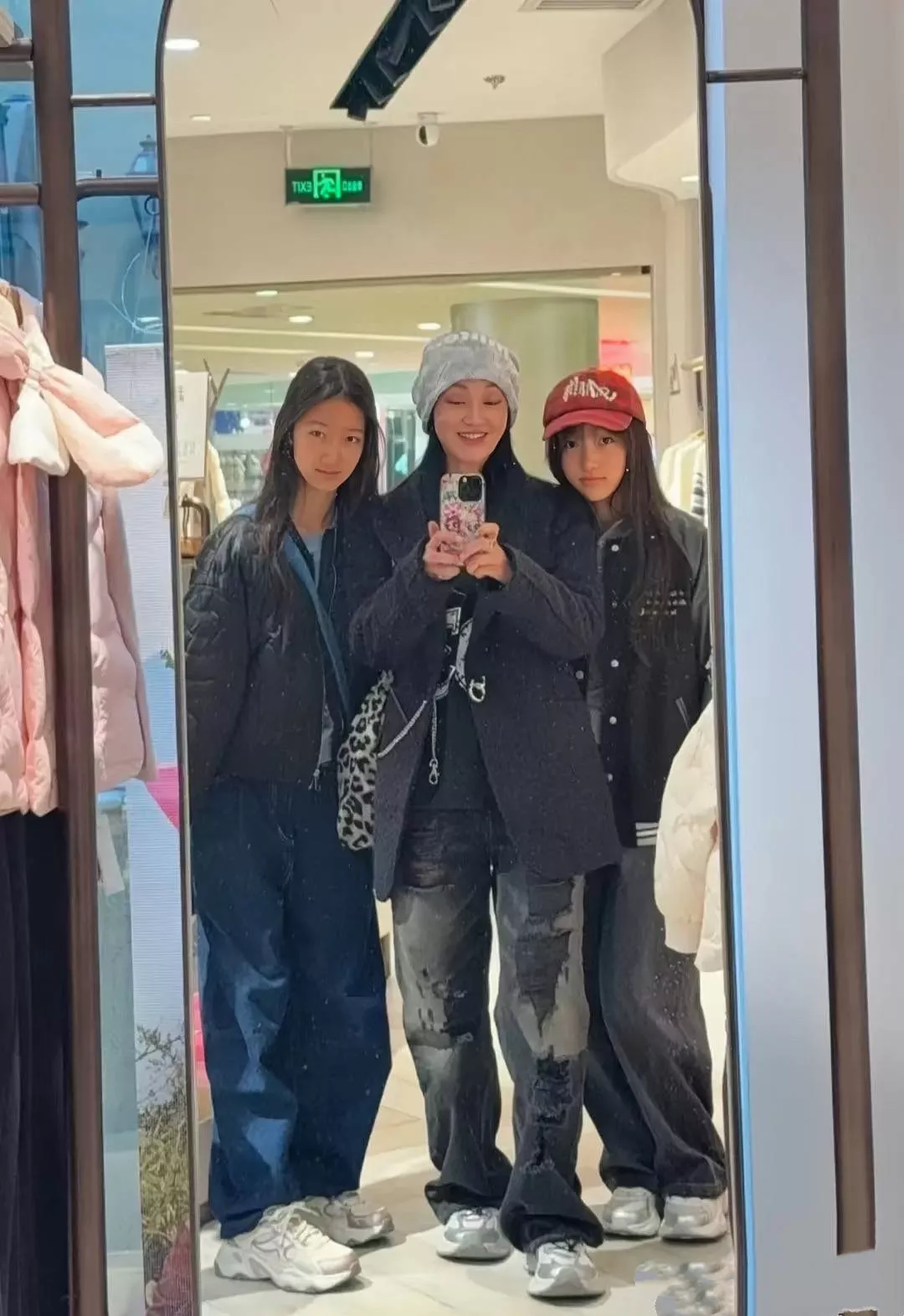 49岁的赵子琪站在中间,她穿了宽松的西服外套、个性的牛仔阔腿裤,两个女儿分别站在两边,这画面太养眼了。