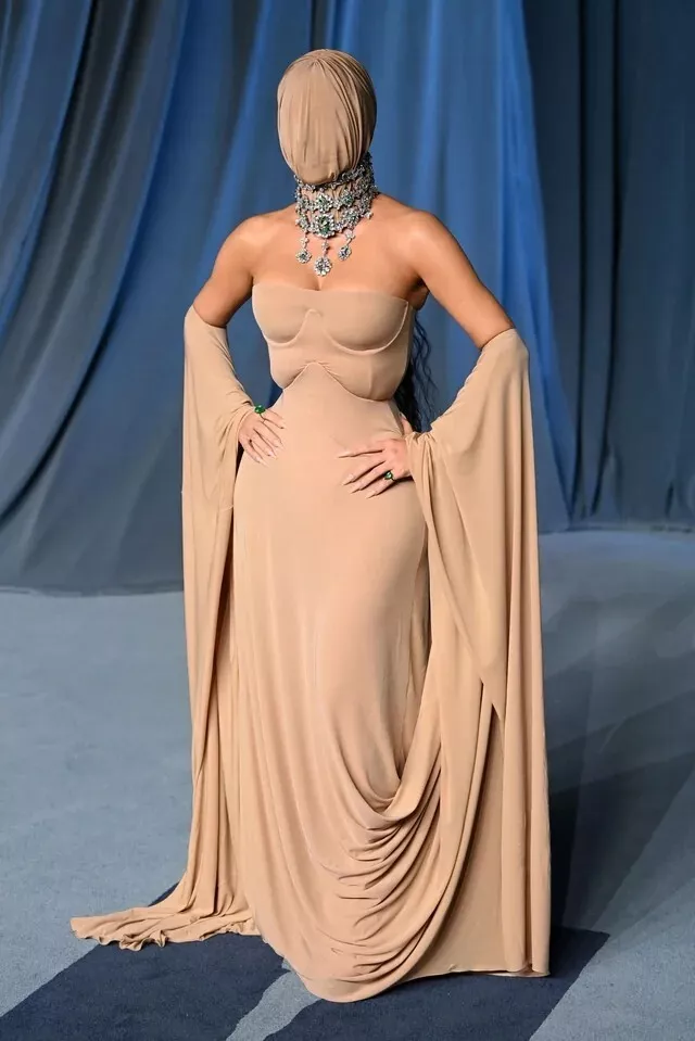 金卡戴珊一袭紧身胸衣的裸色长裙现身红毯,映入眼帘的束腰设计成为焦点,但夸张的蚂蚁腰已经不符合人体构造。
