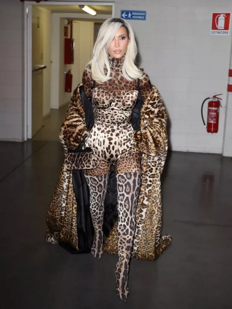 2022年的米兰时装周期间,卡戴珊穿了一身狂野的礼服,全身豹纹印花。这套造型包括一件闪亮的紧身胸衣,内搭同款网眼高领连体裤,以及过膝细高跟靴、夸张的皮草大衣和配套的手袋。
