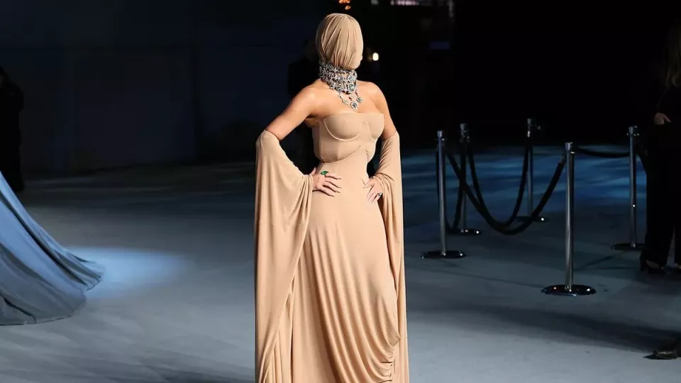 金·卡戴珊在此次活动中穿的礼服的袖子也与裙摆相连,当卡戴珊举起手臂或将手放在腰上时,会产生类似蝙蝠翅膀的效果,将“妖艳”一词展现的淋漓尽致。