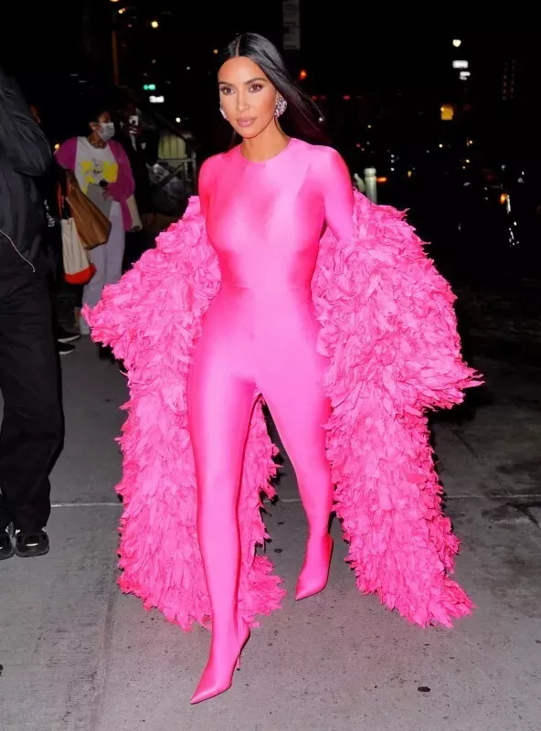2021年金·卡戴珊·韦斯特在美国全国广播公司(NBC)《周六夜现场》节目中主持演出,她身穿巴黎世家定制粉色连体衣现身纽约,搭配该品牌标志性的连体鞋。