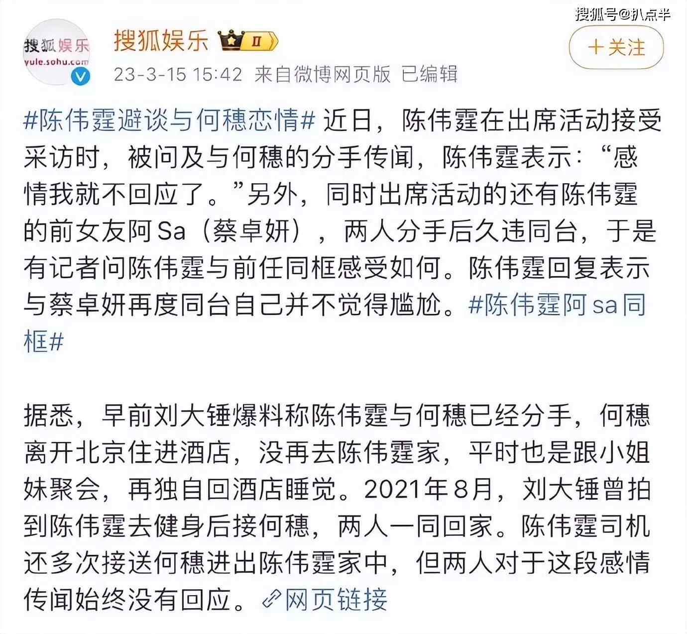 何穗与陈伟霆的绯闻大概要追溯到2019年,当时两人被拍到亲密同行,但女方当时否认了。
