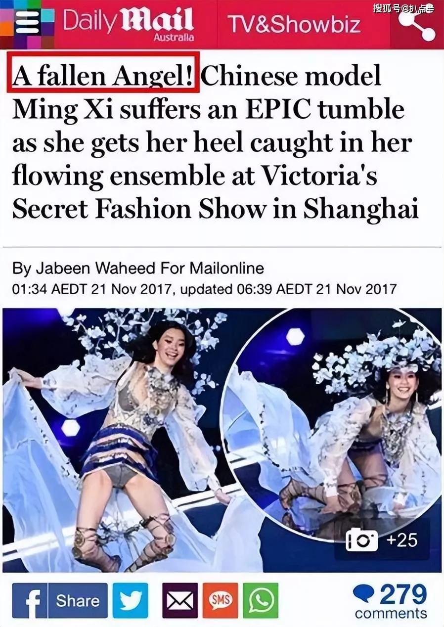 10个月后,在2017上海维密秀的T台上,奚梦瑶在家门口摔倒了——也成了维密史上第一位摔倒的模特。