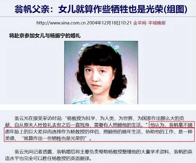 纯粹的爱情吧!”所以,2004年,28岁的翁帆义无反顾地嫁给了82岁的杨振宁。身边的人都用“不可思议”来形容这段婚姻,甚至很多网友都会觉得翁帆父母一定会“无地自容”。