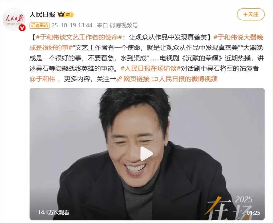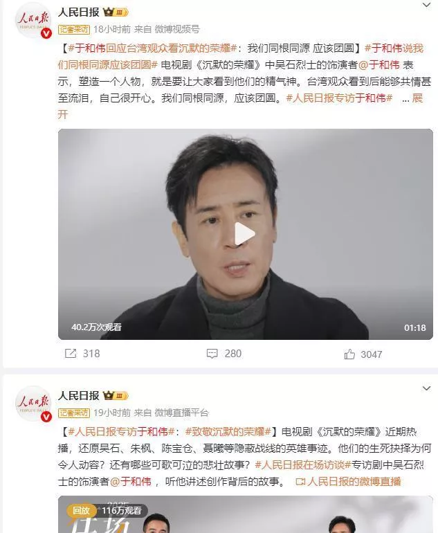 如今,于和伟更是凭借《沉默的荣耀》被人民日报4次点名......
