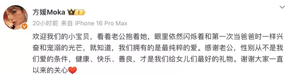 而方媛也发文回应:“看着老公抱着她,眼里依然有第一次当爸爸时的光。性别从不是我们爱的条件,健康、快乐、善良,才是我们给女儿们最好的礼物。”