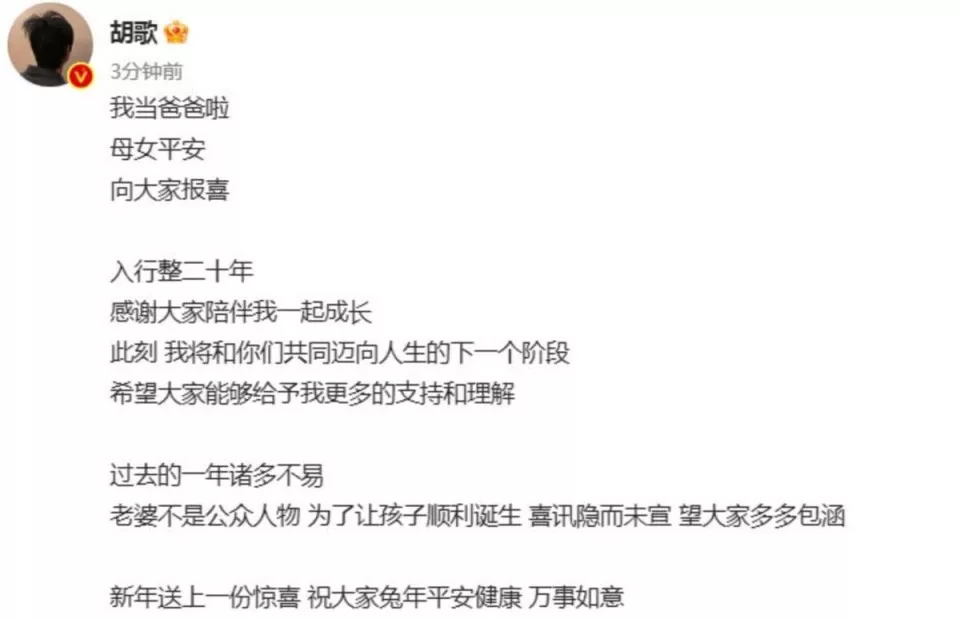 陈伟霆、何穗官宣生子,胡歌感情生活低调成谜,但也是突然就官宣结婚生子。