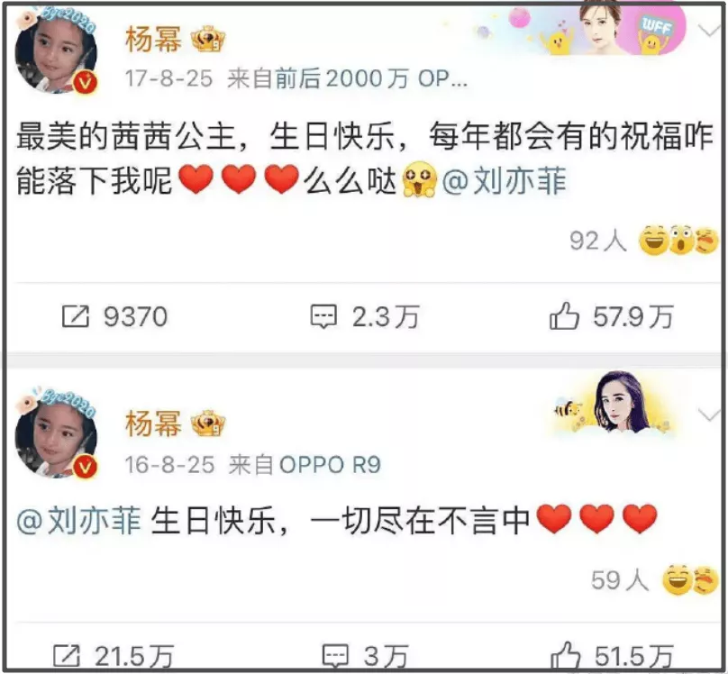 杨幂也曾给刘亦菲每年送过生日祝福,但2017年左右开始就没了。大众印象里,杨幂和刘亦菲正是因为那句“杨幂之后再无白浅”决裂的,