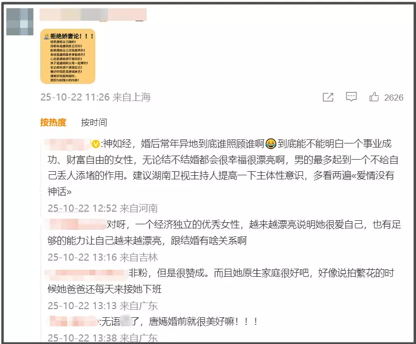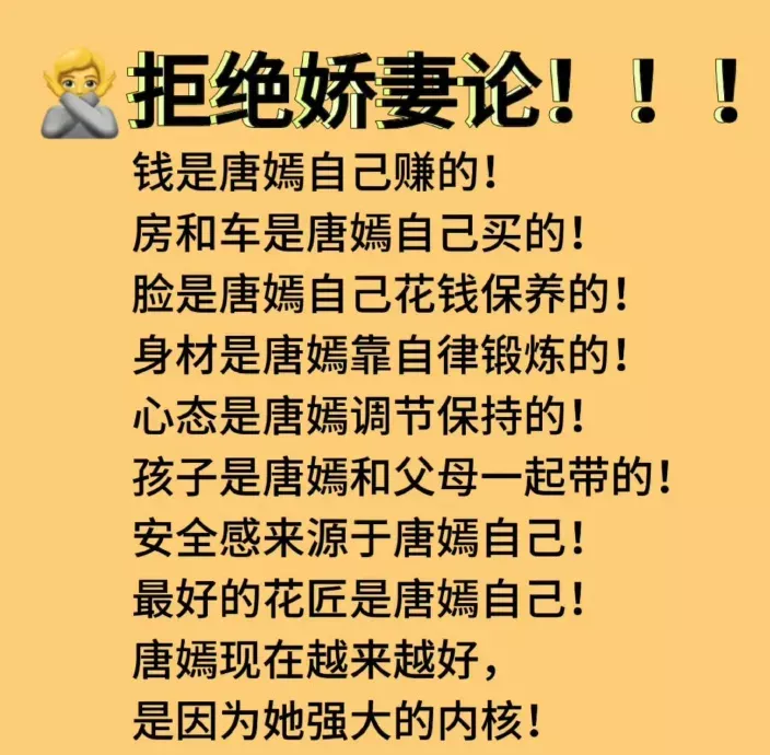 唐嫣的粉丝更是气得跑到评论区刷屏,呼吁拒绝“娇妻论”,获得大批网友认同。