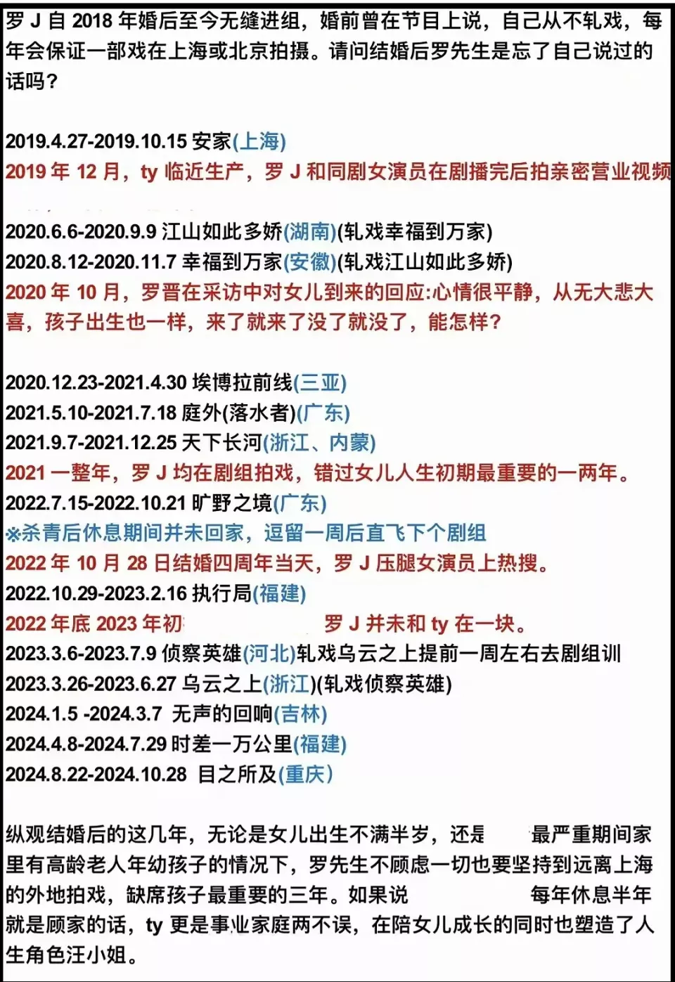 网友深扒之后才发现,唐嫣粉丝早就整理出了罗晋外出拍戏的时间表,怒斥他不遵守婚前承诺,作为父亲没有陪伴孩子成长,把带娃压力都给了唐嫣。