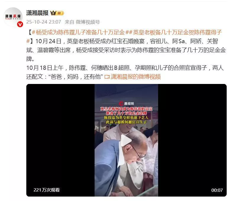 英皇老板杨受成为陈伟霆儿子准备几十万足金