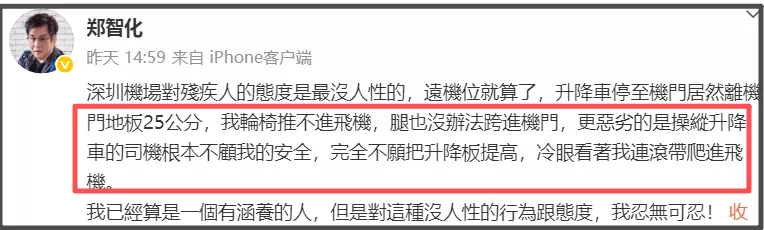 之后,郑智化发文表示接受深圳机场的道歉,且不再追究此事,但又把矛头对准开升降车的司机,斥其行径恶劣。事实上,机场明文规定升降车与机舱门要有20公分的差距,司机只是例行公事,说明郑智化这波发怒的对象错了,可以说深圳机场无障碍设施不完备给郑智化的出行造成了负面影响,但与司机无关。在深圳机场与郑智化相继回应之后,郑智化的评论区沦陷了,热评都是“没有连滚带爬”,误导性太严重,给基层工作人员造成了困扰,应该给他们道歉。